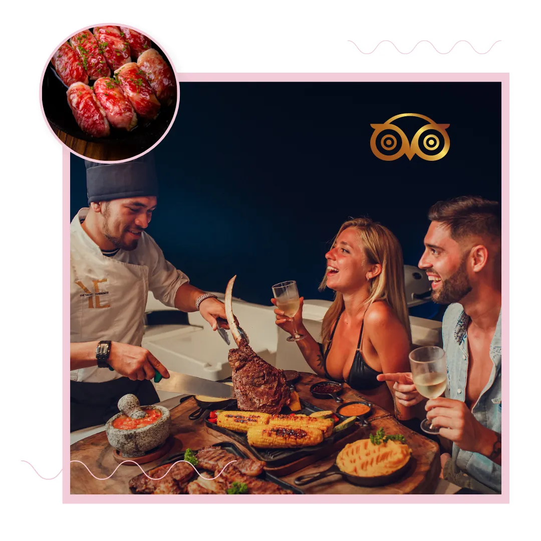Enjoy an unparalleled experience on board with our unlimited premium bar and the expertise of our onboard chef and host. Our a-la-carte menu is designed to surprise your tastes.